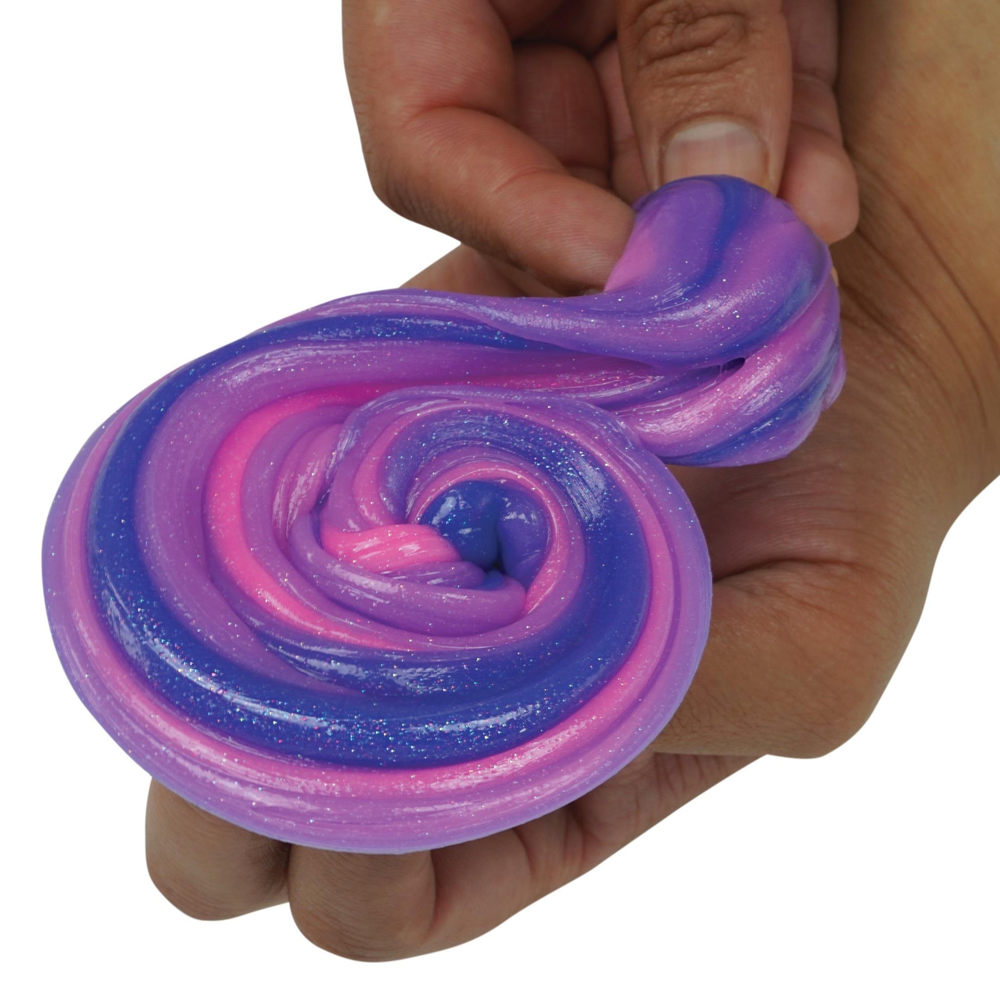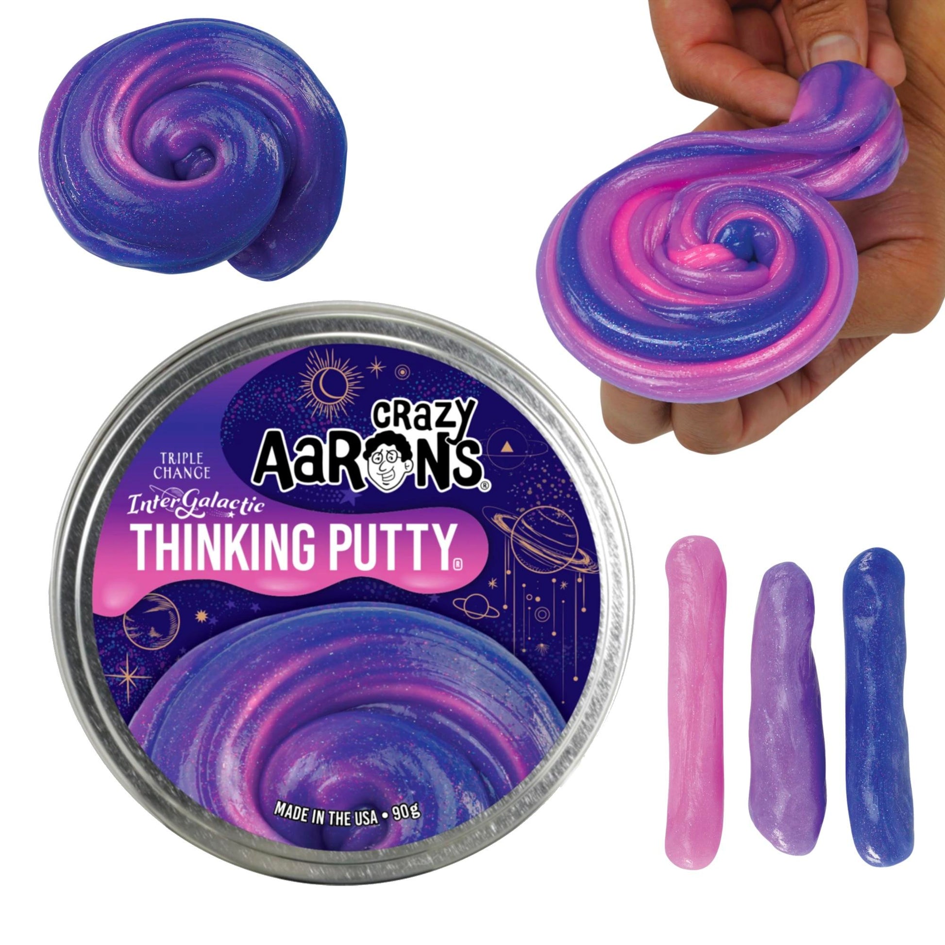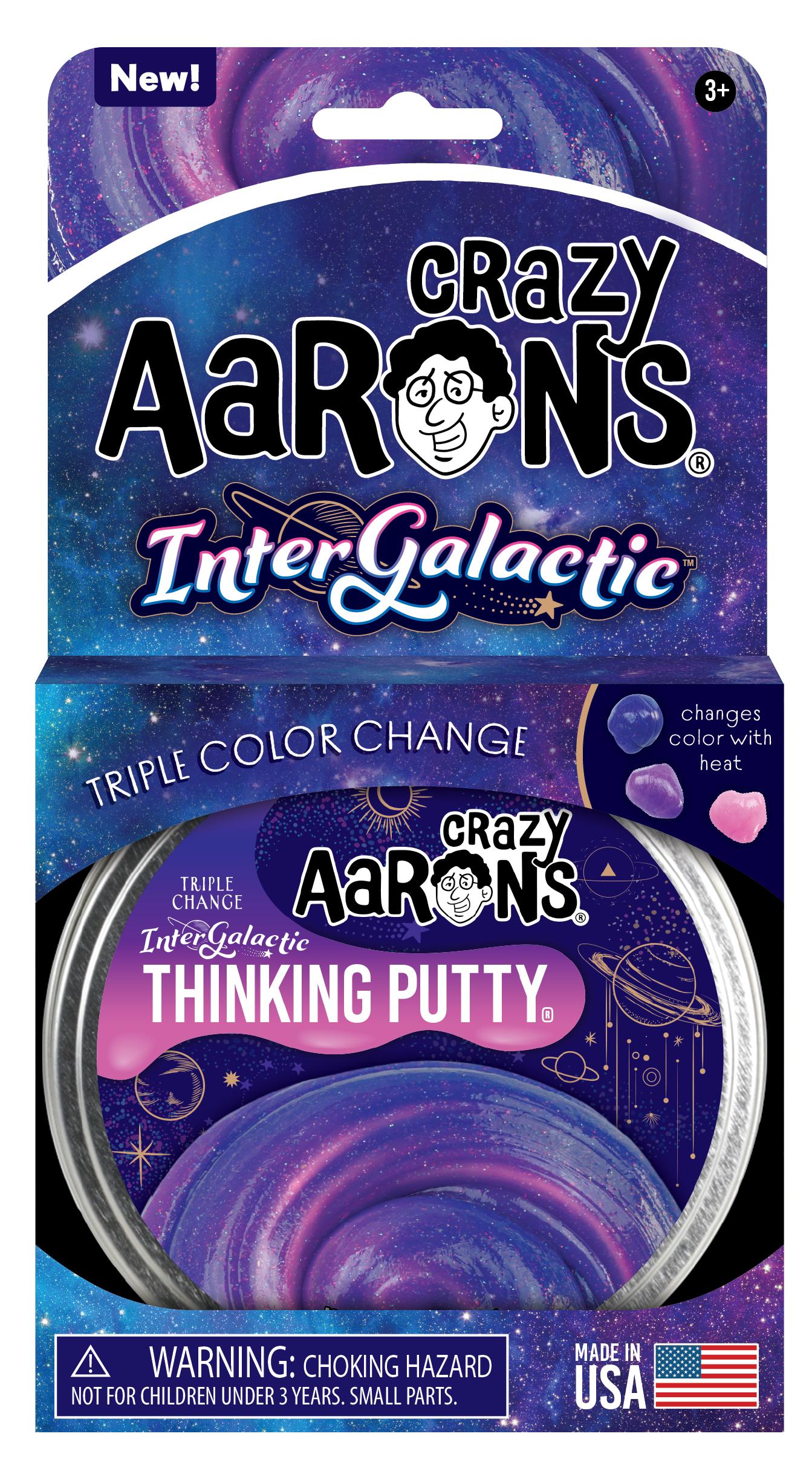 Intergalactic: Leave Earth's atmosphere and blast off to a new galaxy! Use the heat of your hands to transform your Thinking Putty from deep space blue, to ultraviolet purple and then to cosmic pink. Stretch and pull your way into Intergalatic space and create infinite galaxies. Vibrant colors change as you play-flecks shine and shimmer like the stars.
